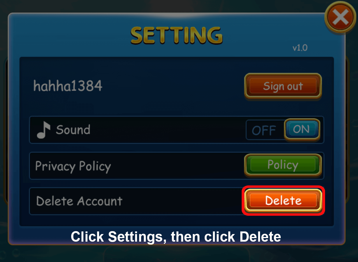 1. Step 1: Click "Setting" -> "Delete Account" button at middle of popup